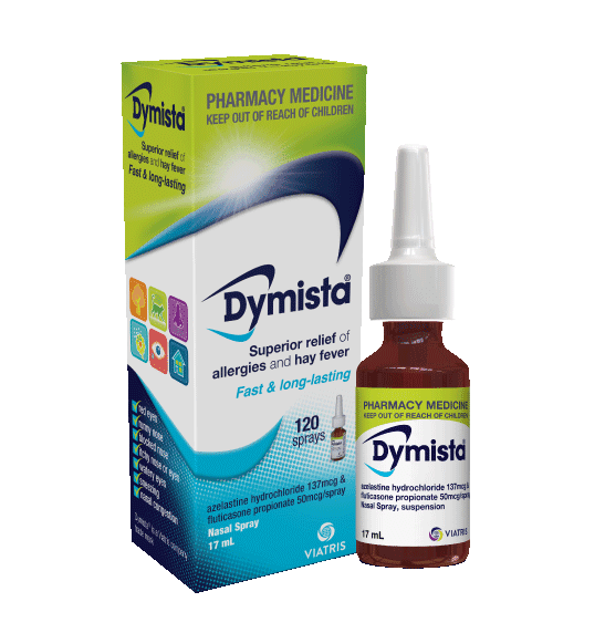 Dymista Nasal Spray combines azelastine hydrochloride (an antihistamine) with fluticasone propionate (a corticosteroid) to provide powerful dual-action relief from moderate to severe seasonal and perennial allergic rhinitis (hay fever) .