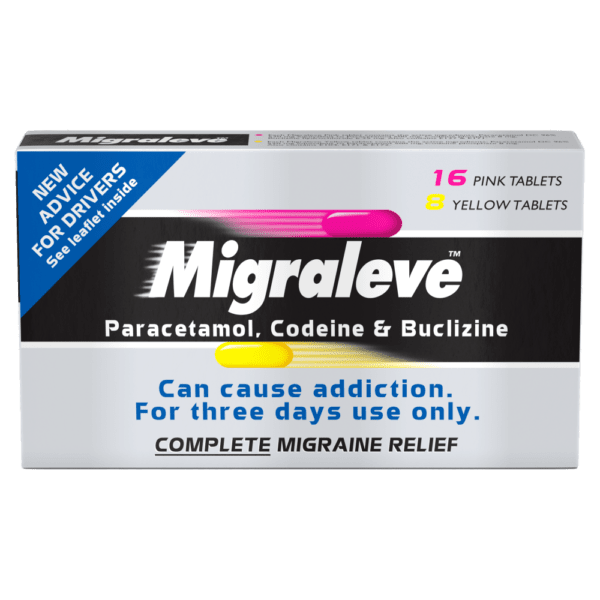 - Migraleve Pink tablets contain an additional anti-nausea agent (buclizine) for the early phase of migraines. Migraleve Yellow tablets are for ongoing pain relief.